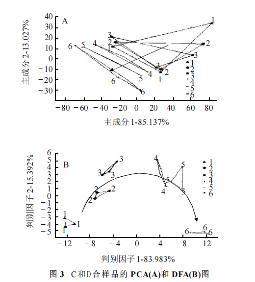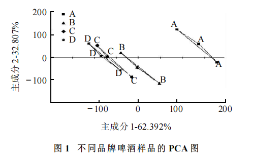 樣品準(zhǔn)備 樣品 C 和 D 進(jìn)行混合,混合比例 C:D(V/V)為 10:90 、30:70 、50:50 、70:30 、90:10 、100:0,編號(hào)分別為1、2、3、4、5、6。 傳感器信號(hào)分析 檢測(cè)每一個(gè)樣品時(shí)傳感器共采集120s 。在進(jìn)行數(shù)據(jù)分析與處理時(shí),采用第120秒所得的穩(wěn)定數(shù)據(jù)作為輸出值進(jìn)行分析。 數(shù)據(jù)分析方法 根據(jù)傳感器采集的原始數(shù)據(jù),分別采用主成分分析 (PCA) 、判別因子分析 (DFA)和偏最小二乘回歸分析(PLS)分析。 結(jié)果與分析 不同品牌啤酒對(duì)比 主成分分析(PCA) PCA 是將所提取的傳感器多指標(biāo)的信息進(jìn)行數(shù)據(jù)轉(zhuǎn)換和降維,并對(duì)降維后的特征向量進(jìn)行線(xiàn)性分類(lèi),最后在PCA圖上顯示主要的兩維圖。橫、縱坐標(biāo)分別表示在 PCA 轉(zhuǎn)換中得到的第一主成分(PC1)和第二主成分(PC2)的貢獻(xiàn)率(或權(quán)重) ,貢獻(xiàn)率越大,說(shuō)明主成分可以較好地反映原來(lái)多指標(biāo)的信息 。