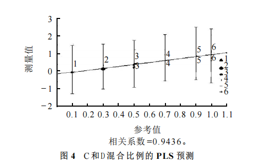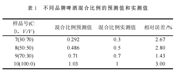 分別以C和D不同混合比例的4個(gè)樣品進(jìn)行模型的驗(yàn)證,結(jié)果見(jiàn)表1 。PLS 模型對(duì)混合比例為30:70 、50:50 、70:30 、100:0 的4個(gè)樣品預(yù)測(cè)效果較好,相對(duì)誤差在1.43%~3.00 %之間。說(shuō)明 PLS 模型能夠很好地預(yù)測(cè)不同品牌啤酒的混合比例。