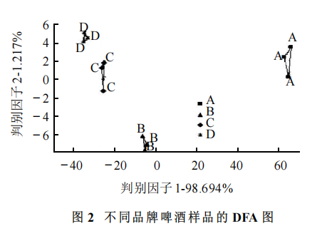 圖1為不同品牌啤酒樣品的主成分分析圖, 第一主成分和第二主成分的總貢獻(xiàn)率達(dá)到了95 .2% ,足以收集特征性信息。不同品牌的啤酒分別聚類(lèi)在 PCA 圖中的不同區(qū)域,相互之間能夠較好地區(qū)分。 判別因子分析(DFA) DFA 是一種通過(guò)重新組合傳感器數(shù)據(jù)來(lái)優(yōu)化區(qū)分性的分類(lèi)技術(shù),它的目的是使各個(gè)組間的重心距離最大同時(shí)保證組內(nèi)差異最小,在充分保存現(xiàn)有信息的前提下,使同類(lèi)數(shù)據(jù)間的差異性盡量縮小,不同類(lèi)數(shù)據(jù)間的差異盡量擴(kuò)大 。