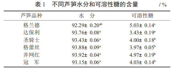 不同蘆筍水分和可溶性糖的含量見表 1。