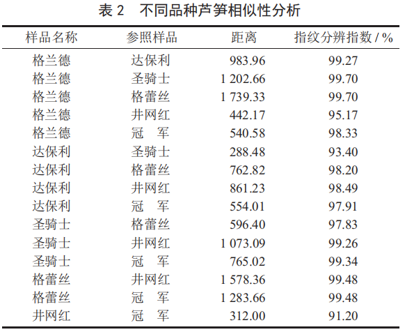 圖 1 為 6 個不同品種蘆筍樣品的主成分 PCA 分析圖,第 1 主成分和第 2 主成分的總貢獻(xiàn)率達(dá)到了98.1%,足以收集特征信息。在圖 1 中,不同品種蘆筍分別聚類在 PCA 圖中的不同區(qū)域,相互之間能夠較好地區(qū)分。