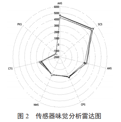 傳感器味覺分析雷達(dá)圖見圖2,不同品種蘆筍的味覺分析見表3。