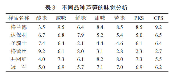 研究表明,6個不同品種的蘆筍水分含量差異較小,可溶性糖含量有所差異,格蘭德品種的可溶性糖含量較高,格蕾絲含量較小,這與電子舌味覺分析一致。格蘭德品種的咸味、甜味和苦味較大,酸味較小;格蕾絲的酸味和鮮味較大,甜味和苦味較小。達(dá)保利品種和圣騎士品種的相似性較大,格蘭德和格蕾絲的相似性最小。采用電子舌技術(shù)可以很好地區(qū)分不同品種蘆筍的味覺差異,還可以利用主成分分析明確地辨別不同品種之間的相似性大小。