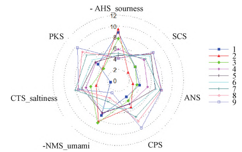 懷區(qū)9種不同主栽品種懷地黃RSD分別為0.42%、1.35%、0.56%、0.34%、0.42%、0.22%、0.22%,樣品3次重復(fù)間相對(duì)標(biāo)準(zhǔn)偏差都比較小,說(shuō)明樣品在重復(fù)測(cè)試過(guò)程中電子舌儀器的穩(wěn)定性、重現(xiàn)性好。由圖5可知,PC1與PC2的貢獻(xiàn)率之和達(dá)到了95.060%,其識(shí)別指數(shù)為93,說(shuō)明這9種生地黃樣品滋味能夠快速地通過(guò)電子舌很好區(qū)分開(kāi)來(lái)。在主成分分析圖中,樣品間的相對(duì)距離越近,則樣品整體滋味越接近,其中“金九”與“85?5”樣品的相對(duì)距離最近,滋味差別最?。?ldquo;噸王”與“沁懷”的相對(duì)距離最遠(yuǎn),滋味差別最大。