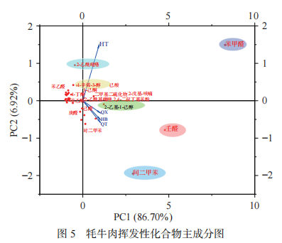 揮發(fā)性化合物數(shù)據(jù)歸一化處理后,進行主成分分析。圖5顯示PC1貢獻率86.70%,PC2貢獻率6.92%,表明主成分經(jīng)降維后數(shù)據(jù)能反映原數(shù)據(jù)整體信息;其中,苯甲醛、壬醛、2-乙酰吡咯、2-乙基-1-己醇、間二甲苯相對含量突出,構(gòu)成牦牛肉的主要化合物;樣品HT中苯甲醛(帶有堅果香氣)、2-乙酰吡咯(烤堅果的風味)相對含量較高,可以確定牦牛肉后腿帶有堅果風味,燒烤后風味獨特;而樣品QX、HB、QT風味化合物主要構(gòu)成是壬醛、間二甲苯、2-乙基-1-己醇,位置相對較近,判斷風味相似。