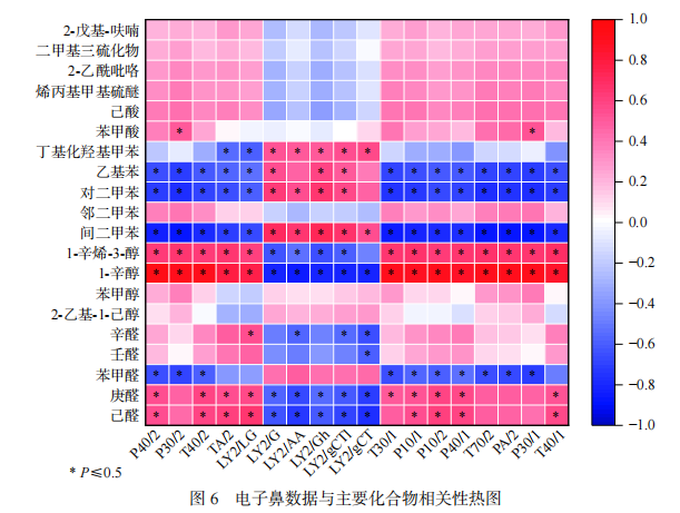 研究表明,取每個類別、相對含量前五揮發(fā)性化合物做相關(guān)性熱圖,可以辨別兩個數(shù)據(jù)之間的關(guān)聯(lián)性和差異性。電子鼻傳感器數(shù)據(jù)是宏觀化合物解析、SPME-GC-MS是具體化合物相對含量,因此有一定的相關(guān)性。采用Pearson相關(guān)性分析,將電子鼻傳感器數(shù)據(jù)與SPME-GC-MS相對含量較高的主要數(shù)據(jù),歸一化處理后,進性相關(guān)性分析。r代表反映X軸、Y軸的線性相關(guān)程度,|r|越大相關(guān)性越強,|r|越小相關(guān)性越弱(r值在-1~1之間),P≤0.5表示顯著,其結(jié)果如圖6所示。