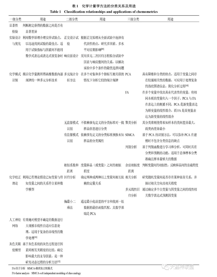 化學(xué)計(jì)量學(xué)是一門新興的化學(xué)分支學(xué)科,被廣泛應(yīng)用于分析化學(xué)的各個(gè)領(lǐng)域,對現(xiàn)有研究中中藥材感官信息定量時(shí)常用的化學(xué)計(jì)量學(xué)方法進(jìn)行總結(jié),并參照《化學(xué)計(jì)量學(xué)方法》及《化學(xué)計(jì)量學(xué)方法及MATLAB實(shí)現(xiàn)》,整理出以上各計(jì)量學(xué)方法的分類關(guān)系及用途見表1。