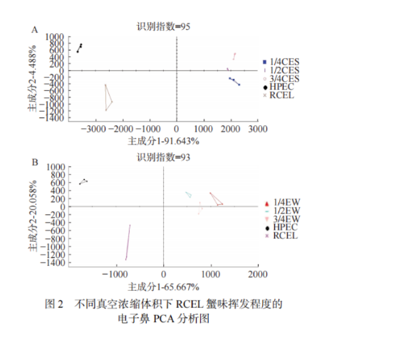 當(dāng)真空濃縮體積分別濃縮至原體積的3/4、1/2、1/4時,停止旋轉(zhuǎn)蒸發(fā)過程,得到CES,同時收集EW,分別記為3/4CES、1/2CES、1/4CES;3/4EW、1/2EW、1/4EW。最后將3/4CES、1/2CES、1/4CES;3/4EW、1/2EW、1/4EW以及RCEL進行電子鼻PCA分析。