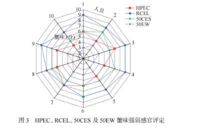 香氣感官評定 隨機選擇10名經(jīng)過感官評定培訓(xùn)的人員,對制備的HPEC、RCEL、50CES和50EW蟹味強弱進行評定,蟹味濃,取7~10分;蟹味稍濃,取4~7分;蟹味較淡,取0~4分。