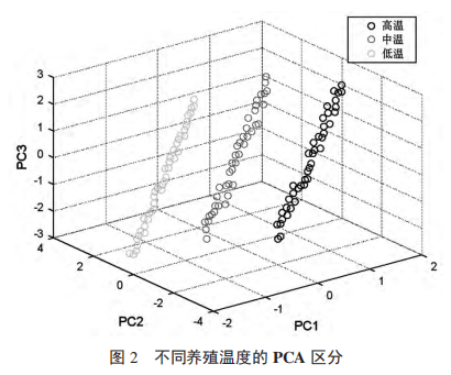 將不同養(yǎng)殖溫度條件的養(yǎng)殖水樣品,使用電子舌進(jìn)行檢測并進(jìn)行主成分分析,由圖 2 可得,主成分分析前 3 個(gè)主要成分貢獻(xiàn)率為 98.7%,其中 PC1 和 PC2的表達(dá)占據(jù)大部分信息。從區(qū)分效果來看,3 種養(yǎng)殖溫度可被明顯分析出,且同一養(yǎng)殖溫度的樣品呈現(xiàn)明顯的聚集特性。