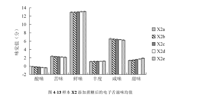 完成鮮味的調(diào)配后,由圖4-11可知樣本X2在甜味上仍與W有一定差距,因此X在添加了MSG的基礎(chǔ)上需要進(jìn)一步提升甜味。在X2中分別添加0.1, 0.2, 0.3, 0.4,0.5 g/100ml的蔗糖,依次命名為X2a, X2b, X2c, X2d, X2e,測試得滋味響應(yīng)如圖4-13所示。由圖可見,隨著糖濃度的升高,樣品的酸味、苦味和咸味有不同程度的下降,而甜味逐漸升高。