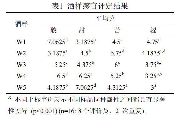 對五種櫻桃酒的感官屬性(酸、甜、苦、澀)進行感官評定,結(jié)果如表 1 所示。由表 1 可知,W1 的酸味和澀感最強,但甜味值最低。W2 的苦味值最大,酸味值最小。W5 甜味值最大,而澀值最小。相比較而言,W3 和 W4 的味覺和口感強度均處于中等強度。