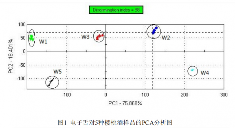 對電子舌采集得到的數(shù)據(jù)進行 PCA 分析,其結(jié)果如圖 1 所示。主成分得分圖以散點圖為基礎(chǔ),每個點代表一個樣品,點之間的距離代表樣品之間特征差異的大小。從圖 1 中可看出同一樣品不同批次的重復(fù)進樣構(gòu)成一個獨立的組群,表示分析的重復(fù)性合格。主成分 1(PC1)和主成分 2(PC2)的累積方差貢獻(xiàn)率為 94.27%,這說明 PC1 和 PC2已經(jīng)包含了較大的信息量,能夠反映樣品的整體信息,可將不同的櫻桃酒在 PCA 圖中明顯的區(qū)分開來。