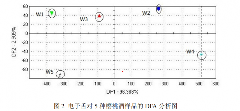 將電子舌采集得到的數(shù)據(jù)進行 DFA 分析,結(jié)果如圖 2 所示。由圖 2 可知,DFA 對櫻桃酒樣品的累積區(qū)分指數(shù)達(dá)到了 99.297%(DF1 為 96.388% ,DF2 為 2.909%),DFA 法能夠?qū)悠烽g差異有更好的區(qū)分度,并且同一樣品組內(nèi)的離散度也比 PCA 法(圖 1)的小,不同樣品組間的區(qū)分更明顯。