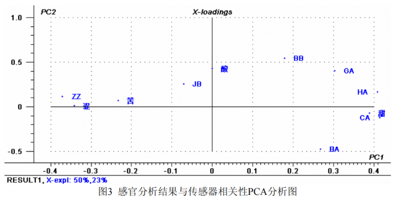 對感官分析結(jié)果與電子舌數(shù)據(jù)進行PCA相關(guān)性分析,如圖3所示。主成份1和2反映了樣品的大都分信息,在圖上距離越近,說明樣品與傳感器的相關(guān)性越強。由圖3 可知,傳感器ZZ與澀、苦味的相關(guān)性較好,傳感器JB與酸味相關(guān)性較強,而傳感器HA、CA與甜味的相關(guān)性較好。