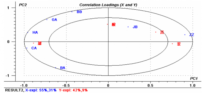 為了進一步確認(rèn)感官分析結(jié)果與電子舌數(shù)據(jù)的相關(guān)性,對兩者進行PLSR分析, 7個不同的傳感器(ZA、BB、BA、GA、HA、JB、CA)作為X變量,感官屬性(酸、甜、苦、澀)作為Y變量,如 圖 4 所示。該 PLSR 模型的方差貢獻(xiàn)率為PC1=55%,PC2=42%。圖4是感官屬性與傳感器的相關(guān)性載荷圖,圖中的兩個橢圓,分別表示50%和100%的方差貢獻(xiàn)率。傳感器ZA、BB、BA、GA、HA、CA和感官屬性澀、和甜味位于兩個橢圓之間,說明該模型可以對這些變量具有更好的解釋能力。由圖4可知,傳感器ZZ與澀、苦味的相關(guān)性較好,傳感器JB與酸味相關(guān)性較強,而傳感器HA、CA與甜味的相關(guān)性較好。此相關(guān)性結(jié)果與圖3 PCA的相關(guān)性結(jié)果相符合。
