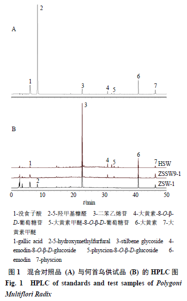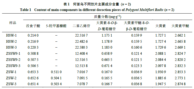 2.2.2 對照品溶液的制備 精密稱定沒食子酸、5-羥甲基糠醛、二苯乙烯苷、大黃素-8-O-β-D-葡萄糖苷、大黃素甲醚-8-O-β-D-葡萄糖苷、大黃素、大黃素甲醚對照品各適量,分別加80%甲醇制成質(zhì)量濃度分別為57.6、68.4、625.0、50.2、8.6、180.0、0.216 μg/mL的對照品溶液,即得。 2.2.3 供試品溶液的制備 取何首烏飲片粉末(過40目篩)約1 g,精密稱定,置平底燒瓶中,精密加入80%甲醇25 mL,密塞,稱定質(zhì)量,加熱回流提取30 min,放冷,密塞,再稱定質(zhì)量,用80%甲醇補(bǔ)足減失的質(zhì)量,搖勻,經(jīng)微孔濾膜(0.45 μm)濾過,即得。 2.2.4 線性關(guān)系考察 分別精密吸取對照品溶液1、5、10、15、20、25 μL,注入液相色譜儀,按“2.2.1”項下色譜條件測定,以對照品質(zhì)量濃度為橫坐標(biāo)(X),峰面積為縱坐標(biāo)(Y)繪制標(biāo)準(zhǔn)曲線,并計算得到回歸方程與線性范圍,結(jié)果分別為沒食子酸Y=28 655.693 5 X-3 449.895 2,R2=1.000 0,線性范圍5.76~144.00 mg/L;5-羥甲基糠醛Y=78 294.955 3 X+11 679.404 8,R2=1.000 0,線性范圍6.84~171.00 mg/L;二苯乙烯苷Y=16 640.258 1 X+12 599.471 0,R2=0.999 9,線性范圍62.50~1 562.50 mg/L;大黃素-8-O-β-D-葡萄糖苷Y=30 743.247 5 X-9 558.630 6,R2=0.999 9,線性范圍5.02~125.50 mg/L;大黃素甲醚-8-O-β-D-葡萄糖苷Y=27 693.578 4 X-241.880 6,R2=1.000 0,線性范圍0.86~21.50 mg/L;大黃素Y=34 965.433 1 X-22 341.082 3,R2=0.999 9,線性范圍18.00~450.00 mg/L;大黃素甲醚Y=37 991.286 3 X+8 456.727 4,R2=1.000 0,線性范圍21.60~540.00 mg/L;結(jié)果表明,各對照品在各自范圍內(nèi)線性關(guān)系良好。 2.2.5 精密度試驗 精密吸取供試品溶液(ZSW-1)10 μL,重復(fù)進(jìn)樣6次,按“2.2.1”項下色譜條件測定,6次測定結(jié)果顯示,沒食子酸、5-羥甲基糠醛、二苯乙烯苷、大黃素-8-O-β-D-葡萄糖苷、大黃素甲醚-8-O-β-D-葡萄糖苷、大黃素、大黃素甲醚峰面積的RSD分別為0.17%、0.39%、0.31%、0.54%、1.64%、0.21%、0.63%,表明儀器精密度良好。 2.2.6 穩(wěn)定性試驗 精密吸取供試品溶液(ZSW-1)10 μL,分別于制備后0、2、4、8、12、24 h進(jìn)樣共6次,按“2.2.1”項下色譜條件測定,結(jié)果沒食子酸、5-羥甲基糠醛、二苯乙烯苷、大黃素-8-O-β-D-葡萄糖苷、大黃素甲醚-8-O-β-D-葡萄糖苷、大黃素、大黃素甲醚峰面積的RSD分別為0.52%、0.82%、0.36%、1.38%、1.54%、0.39%、0.90%,表明供試品溶液在24 h內(nèi)保持穩(wěn)定。 2.2.7 重復(fù)性試驗 取制何首烏粉末(ZSW-1)約1 g,精密稱定,共6份,按“2.2.3”項下方法制備供試品溶液,分別精密吸取10 μL,注入液相色譜儀,按“2.2.1”項下色譜條件測定,記錄峰面積并計算各成分含量,結(jié)果沒食子酸、5-羥甲基糠醛、二苯乙烯苷、大黃素-8-O-β-D-葡萄糖苷、大黃素甲醚-8-O-β-D-葡萄糖苷、大黃素、大黃素甲醚含量的RSD分別為0.33%、0.92%、0.08%、1.65%、1.67%、1.59%、1.90%,表明該方法重復(fù)性良好。 2.2.8 加樣回收率試驗 精密稱定已測定指標(biāo)成分含量的何首烏粉末(ZSW-1)約0.5 g,共6份,置平底燒瓶中,分別加入對照品適量,按“2.2.3”項下方法制備供試品溶液。精密吸取上述樣品與對照品溶液各10 μL,注入液相色譜儀,按“2.2.1”項下色譜條件進(jìn)行測定,記錄峰面積并計算加樣回收率,沒食子酸、5-羥甲基糠醛、二苯乙烯苷、大黃素-8-O-β-D-葡萄糖苷、大黃素甲醚-8-O-β-D-葡萄糖苷、大黃素、大黃素甲醚的平均加樣回收率分別為98.88%、97.99%、97.32%、102.85%、108.12%、96.67%、99.33%,RSD分別為0.36%、0.74%、0.33%、0.74%、0.93%、0.43%、1.16%,均符合《中國藥典》2020年版規(guī)定標(biāo)準(zhǔn)。 2.2.9 樣品測定 分別稱取生何首烏、九蒸九曬何首烏、藥典法制何首烏飲片適量,按“2.2.3”項下方法制備供試品溶液,每個樣品平行2次,按“2.2.1”項下色譜條件進(jìn)行測定,記錄峰面積并計算各成分含量,結(jié)果見表1。含量測定結(jié)果表明,何首烏不同飲片中均含有沒食子酸、二苯乙烯苷、大黃素-8-O-β-D-葡萄糖苷、大黃素甲醚-8-O-β-D-葡萄糖苷、大黃素、大黃素甲醚6種成分,但不同飲片間各成分含量存在一定差異。九蒸九曬、藥典法制何首烏中沒食子酸及蒽醌苷元類成分的含量與生何首烏相比,均有不同程度的增加,其中以沒食子酸含量增加最為顯著,藥典法制何首烏約為生品的3倍,九蒸九曬何首烏約為生品的2倍。炮制為制何首烏后,苷類(二苯乙烯苷、蒽醌苷)成分含量顯著減少,與生何首烏相比,九蒸九曬何首烏中二苯乙烯苷含量減少了約44%,蒽醌苷類成分含量減少了約41%;藥典法制何首烏中二苯乙烯苷含量減少了約69%,蒽醌苷類成分含量減少了約85%;而5-羥甲基糠醛僅在藥典法制何首烏飲片中檢出,平均質(zhì)量分?jǐn)?shù)為0.506 1 mg/g。