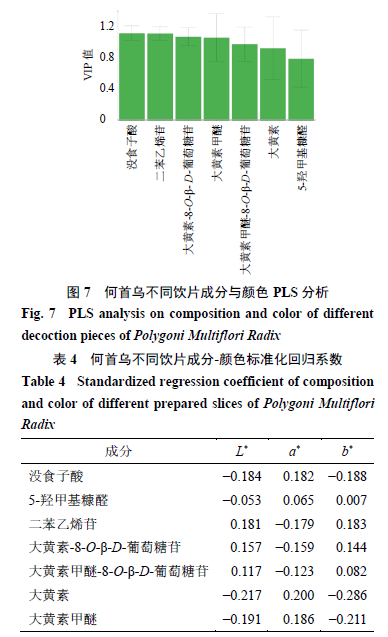 2.5何首烏不同飲片主要成分含量與顏色變化的相關(guān)性分析 普通多元線性回歸建模前提必須滿足樣本數(shù)量較多,變量數(shù)量較少,且變量之間無多重共線性的條件才具有合理性,若數(shù)據(jù)不能完全滿足上述條件,則模型無法使用。本實驗中變量較多,且成分之間存在多重共線性的問題,因此無法采用普通多元線性回歸模型。偏最小二乘回歸(partial least squares regression,PLS)法可以提取出對因變量解釋最強(qiáng)、影響最大的綜合變量,辨識系統(tǒng)中的信息與噪聲,因此很大程度上能夠克服變量之間的多重相關(guān)性在回歸建模中的不良作用,可以有效地解決在普通多元線性回歸的建模過程中因自變量之間存在多重相關(guān)性而影響參數(shù)估計的準(zhǔn)確性和合理性的問題,縮小模型誤差,增強(qiáng)模型的穩(wěn)健性[19]。 在PLS回歸模型中,R2X和R2Y分別表示模型對自變量和因變量的解釋能力,Q2表示模型的預(yù)測能力,通常認(rèn)為上述3個指標(biāo)以大于0.5為宜,越接近1表示模型擬合數(shù)據(jù)效果越好;自變量在解釋因變量時作用的重要性可以用變量投影重要性指標(biāo)(VIP)來度量,通常認(rèn)為VIP值大于1的自變量對因變量有顯著影響。 將測得的成分含量數(shù)據(jù)與顏色指標(biāo)L*、a*、b*值導(dǎo)入SIMCA 14.1軟件,以成分含量作為自變量,各顏色指標(biāo)作為因變量,建立PLS模型。建立的PLS模型R2X=0.991,R2Y=0.988,Q2=0.981,說明建立的模型穩(wěn)定且預(yù)測能力較強(qiáng)。根據(jù)VIP值>1的原則,可發(fā)現(xiàn)沒食子酸、二苯乙烯苷、大黃素-8-O-β-D-葡萄糖苷、大黃素甲醚對何首烏的各顏色指標(biāo)有顯著影響,5-羥甲基糠醛、大黃素甲醚-8-O- β-D-葡萄糖苷、大黃素對何首烏顏色無顯著影響。見圖7。 根據(jù)PLS模型的回歸系數(shù)(表4),沒食子酸、大黃素、大黃素甲醚的含量與L*、b*值呈負(fù)相關(guān),與a*值呈正相關(guān);5-羥甲基糠醛的含量與L*值呈負(fù)相關(guān),與a*、b*值呈正相關(guān);二苯乙烯苷、大黃素-8-O-β-D-葡萄糖苷、大黃素甲醚-8-O-β-D-葡萄糖苷的含量與L*、b*值呈正相關(guān),與a*值呈負(fù)相關(guān)。提示沒食子酸、大黃素、大黃素甲醚這3種成分與何首烏飲片變深、變紅、變藍(lán)有關(guān),與炮制后何首烏飲片顏色總體變化相一致;二苯乙烯苷、大黃素-8-O-β-D-葡萄糖苷、大黃素甲醚-8-O-β-D-葡萄糖苷這3種成分與何首烏飲片變淺、變綠、變黃有關(guān),與炮制后何首烏飲片顏色總體變化相反。