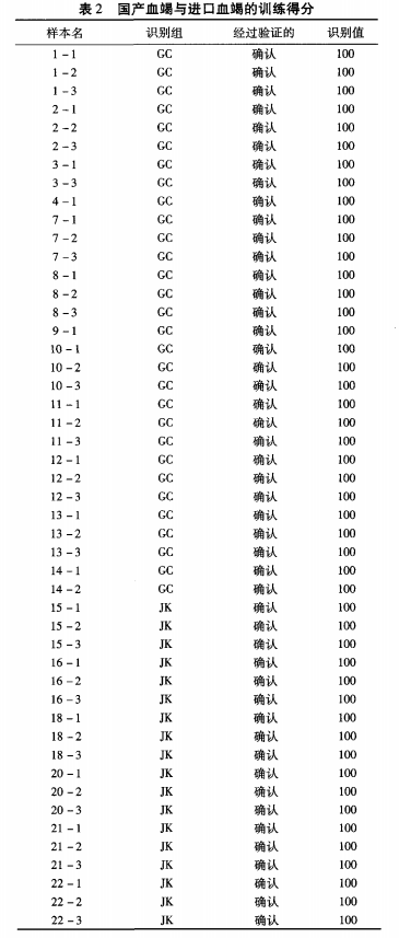 如圖 1所示 ,電子鼻將國產(chǎn)血竭樣品與進(jìn)口血竭樣品分成了兩個區(qū)域 ,紅色區(qū)域為國產(chǎn)血竭 ,兩種不同的血竭樣品的差別主要表現(xiàn)在判別因子 1(100),進(jìn)口血竭落在了Y軸的左側(cè) ,國產(chǎn)血竭落在了Y軸的右側(cè)。訓(xùn)練得分表明所用樣品均經(jīng)過確認(rèn) ,且識別值均為 100分 。由 DFA判別模型可基本知曉國產(chǎn)血竭和進(jìn)口血竭在氣味上有著一定的區(qū)別 。訓(xùn)練得分如表 2所示。