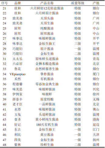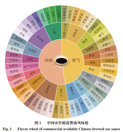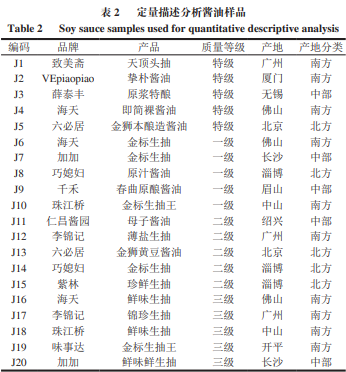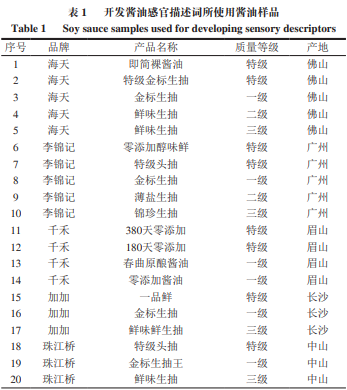 醬油是我國食用歷史悠久的傳統(tǒng)調(diào)味品之一,不僅具有明亮棕紅色的顏色,濃郁的醬香、醇香、焦糖香等 香氣,鮮味、咸味、甜味、濃厚味等綜合味感,能改善食物的色、香、味,還富含類黑精、呋喃類化合物、異黃酮類化合物、大豆多肽等多種功能性活性物質(zhì),具有一定的抗氧化、降血壓和提高免疫力等生理功能,現(xiàn)已成為世界性的大宗調(diào)味品。 我國釀造醬油是以大豆和/或脫脂大豆、小麥和/或麩皮為主要原料,經(jīng)蒸煮、曲霉菌制曲后與鹽水混合成稀醪或固態(tài)醬醅,再經(jīng)微生物(如霉菌、酵母菌、細(xì)菌、乳酸菌等)發(fā)酵制成。根據(jù)醬油中的可溶性無鹽固形物、全氮和氨基酸態(tài)氮含量,將醬油分為4 個級別,即特級、一級、二級和三級。作為調(diào)味品,醬油的風(fēng)味是決定醬油品質(zhì)的重要指標(biāo),更是影響消費(fèi)者購買行為的關(guān)鍵要素。近些年來,關(guān)于中國釀造醬油中揮發(fā)性關(guān)鍵風(fēng)味物質(zhì)和滋味化合物的研究有很多,然而單一的化合物并不能與香氣或滋味簡單地對應(yīng),因?yàn)槭称返母泄僬魇嵌喾N化合物在人嗅覺和味覺受體上反應(yīng)的綜合感受,因此感官分析不可替代,且在產(chǎn)品質(zhì)量評價(jià)中具有重要的作用。風(fēng)味輪是一種可用于描述產(chǎn)品不同風(fēng)味特征的可 視化實(shí)用工具,通過對具體感官屬性描述詞的收集、分類、歸納和整理,形成產(chǎn)品的風(fēng)味特征。風(fēng)味輪可以讓生產(chǎn)者、銷售者、消費(fèi)者等方便地認(rèn)識、研究和應(yīng)用產(chǎn)品的風(fēng)味性質(zhì),在產(chǎn)品研發(fā)、質(zhì)量控制、風(fēng)味營銷等方面發(fā)揮著重要的作用。 1、醬油樣品 釀造醬油樣品均隨機(jī)從市場購買,且均采用高鹽稀態(tài)發(fā)酵工藝。開發(fā)醬油感官描述詞所用樣品共48 個(表1),包括我國釀造醬油的主要品牌,代表了中國釀造醬油的主要特色。感官定量描述分析所使用醬油樣品共20 種(表2),涵蓋了不同等級、不同產(chǎn)地的各類釀造醬油樣品。