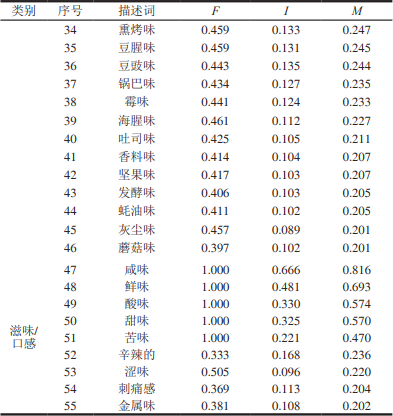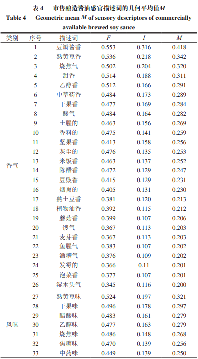 分別對48 種市售醬油樣品的81個感官描述詞進(jìn)行強(qiáng)度評價(jià),并計(jì)算每個描述詞的M值。根據(jù)M值的排序,篩選出55個描述詞,其M值均大于0.2(表4)。M值較大的香氣描述詞有豆瓣醬香、熟黃豆香、燒焦氣、甜香等26 個描述詞匯;風(fēng)味描述詞有熟黃豆味、干果味、醋酸味、乙醇味等20個風(fēng)味描述詞;基本味道有咸味、鮮味、酸味、甜味和苦味5 個描述詞;口感有辛辣的、澀味、刺痛感和金屬味4 個描述詞。從M值上看,醬油的風(fēng)味具有咸、鮮、酸、豆瓣醬香、熟黃豆香/味、燒焦氣等特征,這與我國醬油的加工原料、發(fā)酵工藝有關(guān)。