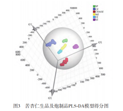 根據(jù)PCA模型分類結(jié)果,按照不同炮制方法將樣品分為6類,建立PLS-DA模型。在PLS-DA模型中,前7個主成分R2X(cum)為99.4%,R2Y(cum)為97.9%,Q2(cum)為97.1%,說明所建立的模型性能良好。如圖3所示,PLS-DA模型得分圖顯示生品和5種炮制品各自聚為一類,表明不同炮制方法可顯著影響苦杏仁的揮發(fā)性成分。