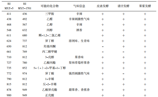 圖3 不同發(fā)酵方式的柿子酒的判別因子分析 電子鼻對不同發(fā)酵方式柿子酒揮發(fā)性香氣成分的定性分析 由表2可知,3種發(fā)酵方式柿子酒的香氣成分中大部分化合物都有存在,其中,醇類、酯類等分子量較小的揮發(fā)性物質(zhì)占絕大多數(shù)。皮渣發(fā)酵、清汁發(fā)酵、果漿發(fā)酵柿子酒的香氣成分中醇類和酯類分別約占50%、52%和46%。3種方式發(fā)酵柿子酒香氣成分中都含有3-戊醇(果香味)、乙酸丙酯(梨和草莓樣果香)、辛醇(強烈的柑橘香氣)、己酸丁酯(特有的菠蘿香氣),使柿子酒增添了獨特風味。皮渣發(fā)酵中含有β-紫羅酮(紫羅蘭、甜果香),清汁發(fā)酵中含有正壬基苯和磷酸三丁酯,果漿發(fā)酵中含有丙二醇甲醚,表示不同發(fā)酵方式柿子酒的香氣成分存在差異。 表2 不同發(fā)酵方式柿子酒中可能的風味信息