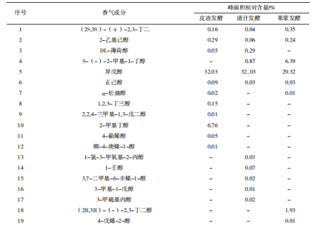 氣相-質(zhì)譜聯(lián)用分析不同發(fā)酵方式柿子酒的香氣成分 由表3可知,異戊醇(蘋果白蘭地香氣、辛辣味)、正己醇(草本植物、青草味)、丁二酸二乙酯(愉快氣味)、乙酸異丁酯(柔和水果酯香味)等是柿子酒香氣成分中相對峰面積最高的物質(zhì),為柿子酒香氣成分中的主要成分。