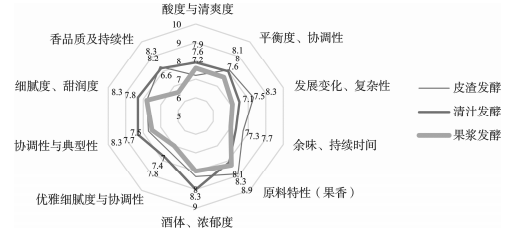 圖4 柿子酒中香氣物質(zhì)分類 不同發(fā)酵方式柿子酒的感官分析 由圖5可知,根據(jù)柿子果酒感官評分標準,對3種發(fā)酵方式柿子酒進行感官評價。研究發(fā)現(xiàn),清汁發(fā)酵柿子酒香氣得分與皮渣發(fā)酵比較接近,在柿子壓榨過程中香氣成分有所損失,與電子鼻檢測結(jié)果相同。清汁發(fā)酵柿子酒綜合感官評分大于果漿發(fā)酵和皮渣發(fā)酵柿子酒,與氣相-質(zhì)譜檢測到清汁發(fā)酵柿子酒香氣成分較多的結(jié)果相同。