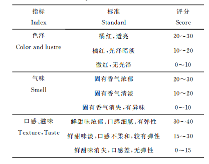 挑選10位專業(yè)人士,組成感官評定小組。根據(jù)評分標準(表1)進行感官評分,以脊尾白蝦色澤、氣味、滋味、口感作為評價指標,取10位評論員打分的平均值進行記錄。100分品質(zhì)最好,80分品質(zhì)良好,60分品質(zhì)可接受,0分品質(zhì)最差。