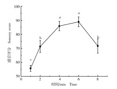 以色澤、氣味、滋味、口感為指標對不同蒸制時間下的脊尾白蝦進行感官評價。在蒸制的前4min,脊尾白蝦的綜合評分呈直線上升,4~6min變化不顯著(P>0.05);當(dāng)蒸制時間為6min時,綜合感官評分最高;在蒸制8min時蝦體色澤暗淡,蝦體有所損壞,綜合評分下降(圖2)。