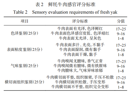 感官評(píng)價(jià) 參考GB/T22210-2008《國(guó)家肉與肉制品感官評(píng)定規(guī)范標(biāo)準(zhǔn)》鑒定標(biāo)準(zhǔn),隨機(jī)選取10位烹飪營(yíng)養(yǎng)與教育專業(yè)學(xué)生組成評(píng)定小組,先期進(jìn)行感官評(píng)價(jià)培訓(xùn),內(nèi)容包括:肉類色澤鑒別、肉類表面粘度鑒別、肉類氣味鑒別、肉類橫切面組織鑒別。然后在專業(yè)感官品評(píng)實(shí)驗(yàn)室對(duì)樣品進(jìn)行感官評(píng)價(jià)。評(píng)分標(biāo)準(zhǔn)見表2。