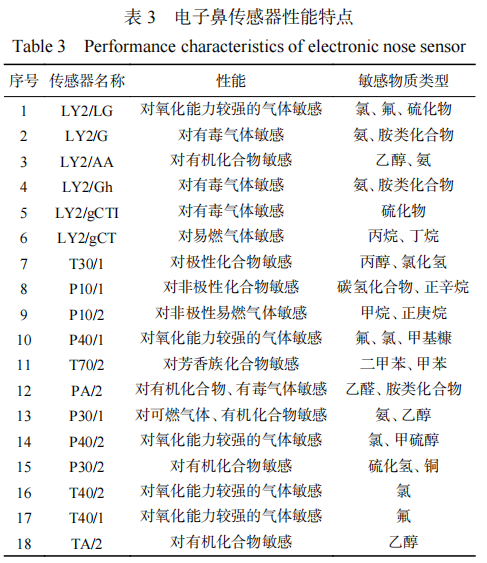電子鼻分析 法國(guó)產(chǎn)電子鼻是通過MXT-5(弱極性)和MXT-7(中極性)色譜柱分離氣味物質(zhì),一共由18根金屬氧化傳感器組成,每根傳感器對(duì)應(yīng)一類或幾類物質(zhì)敏感,采用氫離子檢測(cè)器分析色譜信息,完成檢測(cè)后,即可使用儀器自帶數(shù)據(jù)庫對(duì)樣品揮發(fā)性物質(zhì)進(jìn)行定性、定量分析。電子鼻傳感器性能特點(diǎn)見表3。