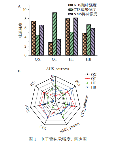 圖1A是電子舌味覺信號(hào)強(qiáng)度圖,可見酸味強(qiáng)度值(AHS):HT>QX>HB>QT,且樣品HT與樣品QT酸味強(qiáng)度值相差5.2,差異顯著;咸味強(qiáng)度值(CTS):QT>HB>HT>QX,且樣品QT與樣品QX咸味強(qiáng)度值相差4.9,差異明顯;鮮味強(qiáng)度值(NMS):HT>QX>HB>QT,且樣品HT與樣品QT鮮味強(qiáng)度值相差4.7,差異明顯。電子舌味覺信號(hào)強(qiáng)度差異表明牦牛肉不同部位滋味差異明顯。