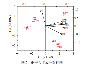 圖2顯示主成分PC1貢獻(xiàn)率為73.36%、PC2貢獻(xiàn)率為22.10%,表明主成分降維后數(shù)據(jù)能反映原數(shù)據(jù)的整體信息,四個(gè)樣品分布在四個(gè)象限中,無重疊,表明樣品之間存在較明顯差異性。主成分雙標(biāo)圖貢獻(xiàn)影響因子在圖中以線段表示,越靠近樣品所在坐標(biāo)軸,說明影響因子對(duì)其影響越大。樣品HT最靠近X軸,且樣品HT與QX相近,滋味相似;樣品HB距離其他樣品較遠(yuǎn),位于第四象限,其滋味差異主要體現(xiàn)在PC1上;結(jié)果表明,電子舌能明顯區(qū)分四個(gè)部位樣品,且樣品之間滋味差異明顯。