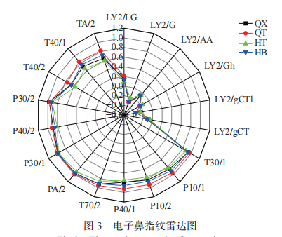 四個(gè)部位電子鼻氣味指紋雷達(dá)圖3表明:樣品HT在P10/1、P10/2、P40/1與其他樣品出現(xiàn)差異,P型傳感器一般對(duì)極性化合物和非極性化合物敏感;樣品HT與QT在T40/2、T40/1、TA/2區(qū)分較為明顯,而T型傳感器對(duì)氧化氣體和含硫化合物敏感,說明在含硫化合物含量上樣品HT與樣品QT差異較大。
