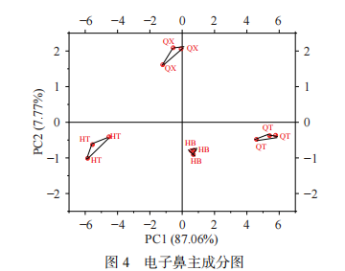 如圖4所示:四個(gè)部位樣品能夠獨(dú)立區(qū)分出來,說明電子鼻能夠辨別樣品氣味特征,且PC1貢獻(xiàn)率為87.06%、PC2貢獻(xiàn)率為7.77%,說明大量有效信息存在于第一主成分。可以判斷,樣品HT、HB、QT氣味特征相近,樣品QX氣味特征與其他部位差異較大。