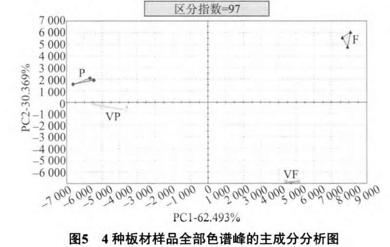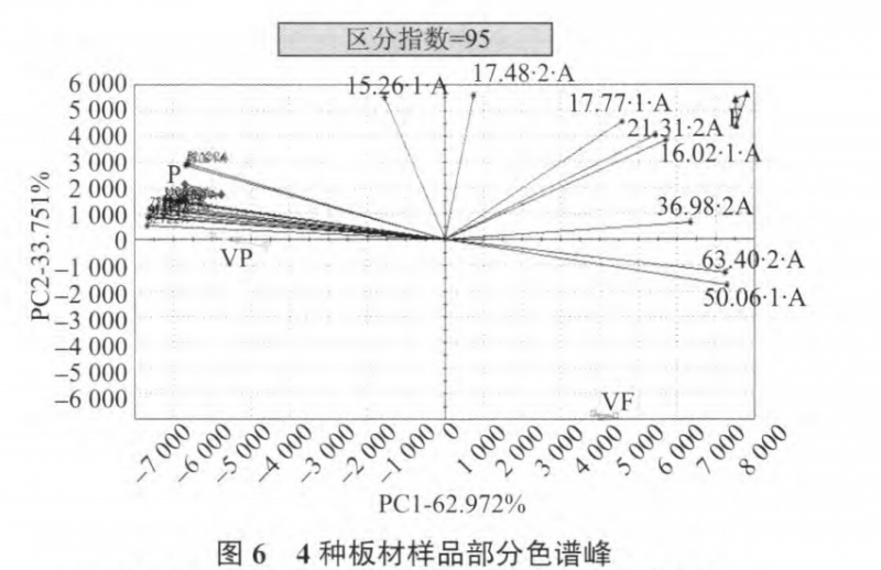 通過篩選峰面積較大(峰面積>l ooo)及樣品分較為明顯(區(qū)別能力>0.9)色譜峰優(yōu)化試驗(yàn)結(jié)果見圖6,且標(biāo)注出貢獻(xiàn)區(qū)分的主要色譜峰。圖5與圖6無明顯差異,4種樣品分布趨勢相同,刨花板與貼面刨花板距離較為接近,纖維板與貼面纖維板的距離較遠(yuǎn)。