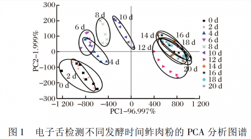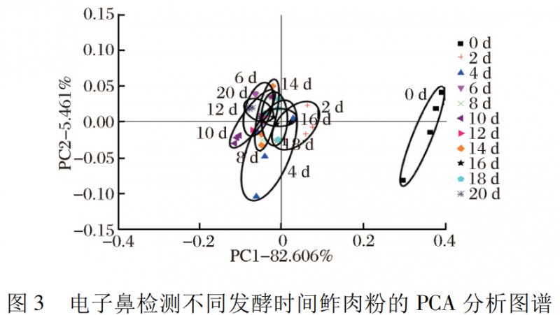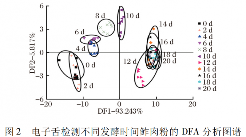 由圖 2 中 DFA 圖譜可知第一主成分貢獻(xiàn)率為93.243% ,第二主成分貢獻(xiàn)率為5. 817% ,2 種主要成分累積貢獻(xiàn)率為 99.06% ( 超過(guò) 85% ) ,說(shuō)明 2 種主成分包括鲊肉粉滋味物質(zhì)的大部分信息。從 DFA 圖譜中看出,第 0 ~ 10 天,鲊肉粉發(fā)酵規(guī)律同 PCA 圖譜類似,但從第 12 ~ 16 天,鲊肉粉從左下方向右上方移動(dòng)且小部分與第 18 天和第 20 天重疊,說(shuō)明發(fā)酵中期隨時(shí)間的改變鲊肉粉的滋味物質(zhì)也有所改變且不同于發(fā)酵后期,從第 18 天和第 20 天樣品重疊在一起,說(shuō)明發(fā)酵后期鲊肉粉產(chǎn)生的滋味物質(zhì)逐漸趨于穩(wěn)定。