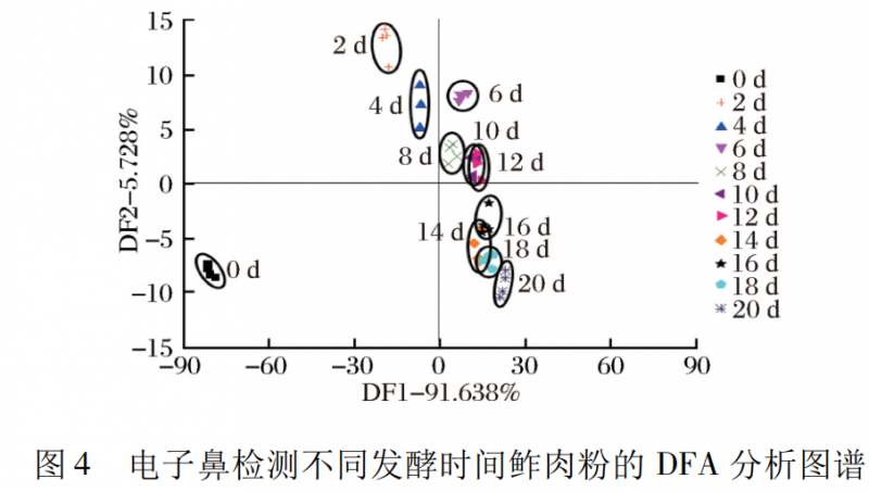 由圖 4 的 DFA 圖譜可知第一主成分貢獻(xiàn)率為91.638% ,第二主成分貢獻(xiàn)率為5. 728% ,2 種主要成分累積貢獻(xiàn)率為 97.366% ( 超過(guò) 85% ) ,說(shuō)明 2 種主成分包括鲊肉粉氣味物質(zhì)的大部分信息。從 DFA 圖譜中可以看出第 0 天的鲊肉粉樣品分布于左側(cè)下半部分,顯著區(qū)別于其他鲊肉粉樣品; 發(fā)酵第 2 ~ 20 天,隨發(fā)酵時(shí)間的延長(zhǎng),鲊肉粉樣品逐漸向右下方移動(dòng),說(shuō)明不同發(fā)酵時(shí)間的鲊肉粉的氣味物質(zhì)不同。發(fā)酵第 2 ~ 6 天從左上方向右下方移動(dòng)且幅度較大,說(shuō)明發(fā)酵初期鲊肉粉氣味物質(zhì)變化較大; 發(fā)酵第 8 ~ 12 天樣品分布較集中,說(shuō)明鲊肉粉氣味物質(zhì)比較類似; 發(fā)酵第 14 ~ 20 天樣品部分重疊,說(shuō)明鲊肉粉氣味相近。