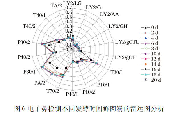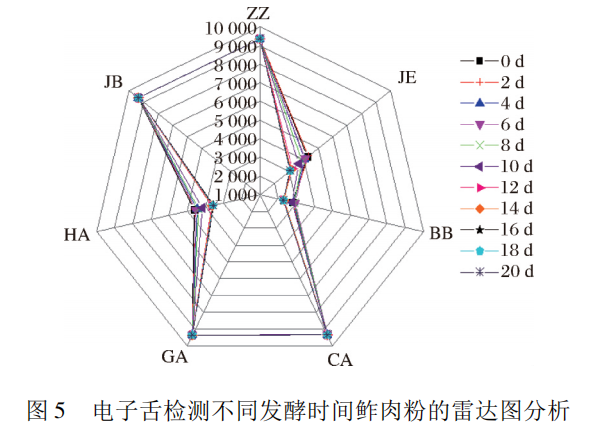 電子舌對(duì)不同發(fā)酵時(shí)間鲊肉粉的雷達(dá)圖分析