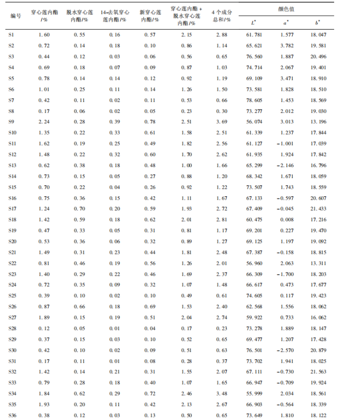 表4 穿心蓮粉末色度值與4個二萜內(nèi)酯類成分含量的相關性分析