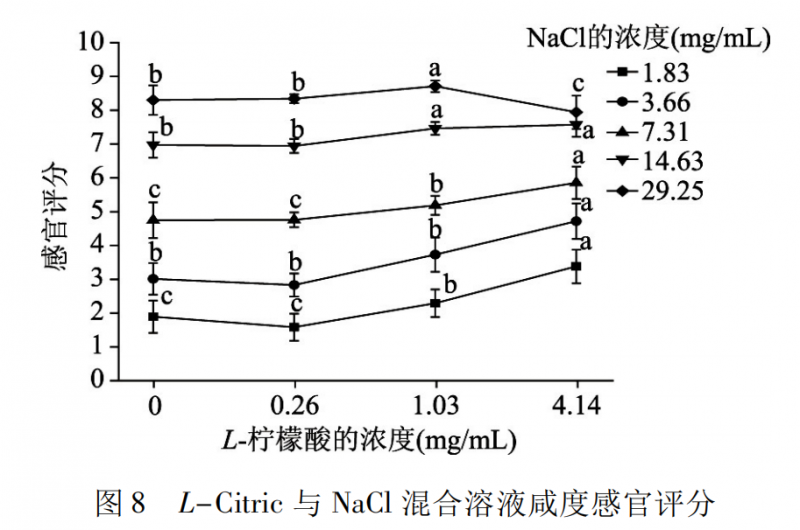 圖8 是 L-Citric 與 NaCl 混合溶液咸度的感官評定結(jié)果。在相同的氯化鈉濃度水平下,添加 0.26 mg /mL L-檸檬酸的混合溶液與氯化鈉溶液的咸度沒有顯著差異( p > 0.05) ,添加 1.03、4.14 mg /mL L-檸檬酸的混合溶液的咸度則顯著高于氯化鈉溶液的咸度( p <0.05) ; 但是在 29.25 mg /mL 氯化鈉濃度下添加4.14 mg /mL L-檸檬酸時,混合溶液的咸度則受到抑制,不同的味道在口中具有不同的傳導途徑,當氯化鈉和檸檬酸的濃度過高時,檸檬酸會對氯化鈉的味覺傳導途徑產(chǎn)生影響,阻礙了氯化鈉咸度的感知。