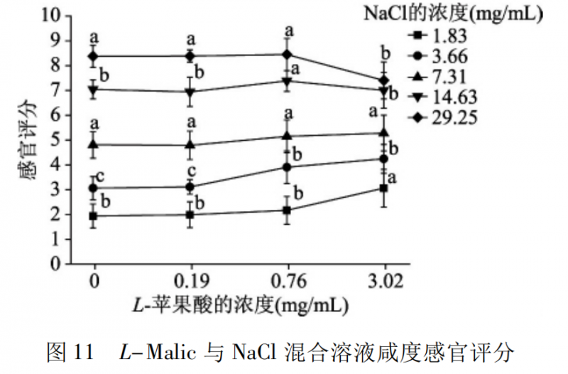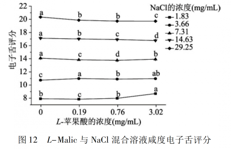 圖 11 是 L-Malic 與 NaCl 混合溶液咸度的感官評定結(jié)果。在 1.83、3.66 mg /mL 的氯化鈉濃度下,添加 0.76、3.02 mg /mL L-蘋果酸的混合溶液的咸度顯著高于氯化鈉溶液(p < 0.05) ; 在 29.25 mg /mL 氯化鈉濃度下,添加 3.02mg /mL L-蘋果酸的混合溶液的咸度顯著低于氯化鈉溶液(p < 0.05) 。圖 12 是電子舌對溶液咸度的評定結(jié)果。在 1.83,3.66 mg /mL 的氯化鈉濃度下,混合溶液的咸度顯著高于氯化鈉溶液( p <0.05) ; 而在其他氯化鈉濃度下,混合溶液的咸度顯著低于氯化鈉溶液( p < 0.05) ,其中在 7.31 mg /mL的氯化鈉濃度下,添加 3.02 mg /mL L-蘋果酸的混合溶液的咸度顯著高于其他兩組混合溶液,但仍顯著低于氯化鈉溶液( p < 0.05) 。將 L-蘋果酸與氯化鈉混合溶液咸度的感官評定結(jié)果和電子舌評定結(jié)果進行相關(guān)性分析,發(fā)現(xiàn)其相 關(guān) 性 系 數(shù) r = 0.984 ( p <0.01) 。