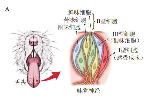 味蕾是人體的味覺感受器,其超微結(jié)構(gòu)含有多種味覺細胞,負(fù)責(zé)感受甜、苦、咸、酸和鮮等風(fēng)味,在味覺感知的過程中起關(guān)鍵作用。味蕾的超微結(jié)構(gòu)如圖1A所示,苦、甜和鮮味刺激由II型細胞檢測,酸味刺激由III型細胞檢測,而檢測咸味刺激的味蕾細胞尚未明確,Chandrashekar等通過對嚙齒類動物味覺細胞的研究發(fā)現(xiàn),咸味的感知主要與I型類膠質(zhì)細胞有關(guān)。咸味的感知途徑為刺激物作用于味覺細胞的頂端致使細胞膜發(fā)生去極化,產(chǎn)生動作電位,從而釋放神經(jīng)遞質(zhì)并發(fā)生傳遞,最終傳入神經(jīng)反饋大腦。刺激物的不同,所引導(dǎo)的感知與傳遞不同。目前常見的咸味刺激物主要是以NaCl為主的金屬鹽類,但隨著研究的不斷深入,非金屬離子的咸味刺激物不斷涌現(xiàn)。非金屬離子類刺激物非金屬離子的咸味刺激物以氨基酸、核苷酸和小分子多肽為代表,其涉及受體和咸味傳導(dǎo)途徑復(fù)雜。