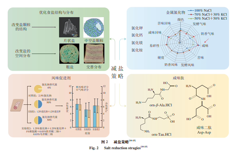 要達到“減鹽不減咸”的目的,可以基于以上咸味傳導(dǎo)途徑的特點,從多方面、多角度減少Na+過量攝入。如通過設(shè)計食物中Na+分布等,提高咀嚼過程中Na+在口腔中的釋放速率;或者使用非Na+的金屬鹽代替NaCl作為咸味調(diào)味品;除此之外,還可使用非離子型的風(fēng)味促進劑,如咸味香精、咸味肽等提高咸味的感知。目前常見的減鹽策略如圖2所示。