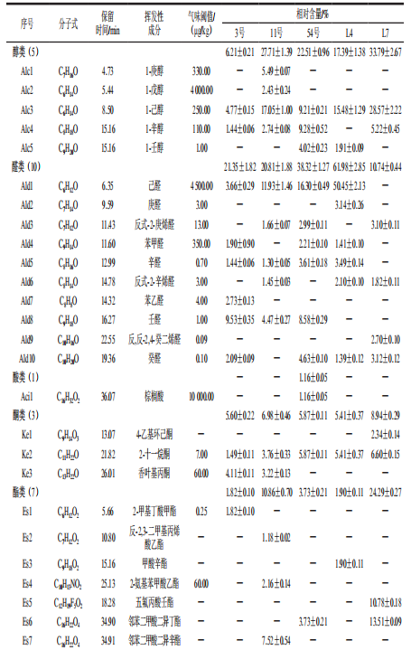 金針菇品種繁多,并且各種新品種不斷研發(fā)栽培。不同品種金針菇的生長特性、出菇特性、商品性狀和生物轉(zhuǎn)化率不同,而風味物質(zhì)也存在各自的差別和獨特之處。本研究采用SPME-GC-MS和電子鼻分析5個品種金針菇揮發(fā)性物質(zhì),由定量分析、PCA、HCA探究不同品種金針菇揮發(fā)性物質(zhì)差異,并通過SPME-GC-MS結(jié)合電子鼻進行PCA對比品種鑒定準確率。 5個金針菇樣品組(3號、11號、54號、L4和L7),測定前將樣品用液氮研磨。 GC-MS聯(lián)用儀;FOX3000型電子鼻。 用液氮研磨后,準確地稱量2.0g金針菇樣品于20mL頂空瓶中。將DVB/CAR/PDMS型萃取頭在250℃活化20min后,在60℃水浴中進行靜態(tài)吸附萃取40min,將萃取頭放入GC進樣口解吸。 以正構(gòu)烷烴的實際測量值校正保留時間,SPME-GC-MS測定結(jié)果通過NIST98數(shù)據(jù)庫(NIST08,華盛頓特區(qū))進行檢索,取匹配度80%以上的揮發(fā)性成分;以2-氯苯甲醛為內(nèi)標物對各化合物進行定量分析。 用液氮研磨后,精確稱取2.0g金針菇樣品于20mL頂空瓶內(nèi)。樣品測量流速150mL/min,檢測時間120s。電子鼻配備12個不同的氣體傳感器:LY2/LG、LY2/G、LY2/AA、LY2/GH、LY2/gCTL、LY2/gCT、T30/1、P10/1、P10/2、P40/1、T70/2和PA/2,通過傳感器陣列響應和模式識別技術(shù)對揮發(fā)性氣體分子進行分析。 利用相對氣味活度值(relativeodoractivityvalue,ROAV)評定各揮發(fā)性化合物對樣品總體氣味的貢獻,定義對樣品風味貢獻最大的組分:ROAVstan=100,則其他揮發(fā)性化合物的ROAV小于100,按下式計算: