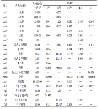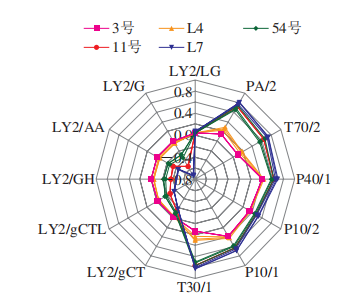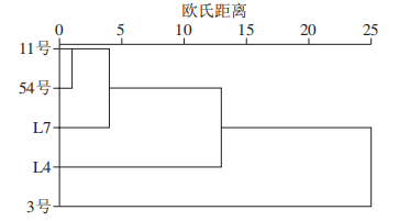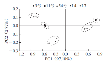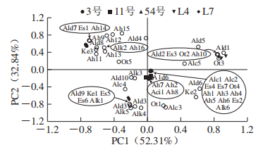 式中:Cri、Ti分別為各揮發(fā)性化合物的相對含量/%和氣味閾值/(μg/kg);Crstan、Tstan分別為對樣品風味貢獻最大組分的相對含量/%和氣味閾值/(μg/kg)。 ROAV≥1的物質(zhì)為該品種金針菇的特征揮發(fā)性物質(zhì);0.1≤ROAV<1的物質(zhì)對該品種金針菇整體風味有修飾作用,且ROAV越大說明該物質(zhì)對該品種樣品總體風味貢獻越大。 不同品種金針菇揮發(fā)性物質(zhì)的SPME-GC-MS分析 如表1所示,5個品種金針菇樣品中共檢測出53種揮發(fā)性成分,3號、11號、54號、L4和L7分別檢測出21、29、21、12種和18種成分,其中醇類、醛類和芳香烴類占總含量的60%~95%。不同品種金針菇僅有2種共有揮發(fā)性成分,分別為1-己醇和2-十一烷酮。每種金針菇都有3種或3種以上其他品種中不存在的化合物,3號、11號、54號、L4和L7中特有化合物數(shù)量分別為3、12、3、4種和4種。 表1 不同品種金針菇樣品中揮發(fā)性化合物的相對含量 如表2所示,辛醛、苯乙醛、壬醛、癸醛、2-十一烷酮、2-甲基丁酸甲酯、D-檸檬烯為3號金針菇的特征揮發(fā)性物質(zhì)(ROAV≥1),香葉基丙酮對3號金針菇的整體風味起修飾作用(0.1≤ROAV<1);1-己醇、反式-2-庚烯醛、辛醛、反式-2-辛烯醛、壬醛、2-十一烷酮、香葉基丙酮、2-正戊基呋喃、D-檸檬烯為11號金針菇的特征揮發(fā)性物質(zhì)(ROAV≥1),1-庚醇、1-辛醇對11號金針菇的整體風味起修飾作用(0.1≤ROAV<1);1-壬醇、辛醛、壬醛、癸醛、2-十一烷酮、D-檸檬烯為54號金針菇的特征揮發(fā)性物質(zhì)(ROAV≥1),1-辛醇、反式-2-庚烯醛對54號金針菇的整體風味起修飾作用(0.1≤ROAV<1);1-壬醇、庚醛、辛醛、反式-2-辛烯醛、癸醛、2-十一烷酮、2-正戊基呋喃為L4金針菇的特征揮發(fā)性物質(zhì)(ROAV≥1),1-己醇對L4金針菇的整體風味起修飾作用(0.1≤ROAV<1);反式-2-辛烯醛、反,反-2,4-癸二烯醛、癸醛、2-十一烷酮為L7金針菇的特征揮發(fā)性物質(zhì)(ROAV≥1),1-己醇、1-辛醇、反式-2-庚烯醛對L7金針菇的整體風味起修飾作用(0.1≤ROAV<1)。 5種金針菇中共檢測出5種醇類化合物,存在于4個品種金針菇中的1種,是1-辛醇,1-庚醇和1-戊醇均只在11號金針菇中被檢測到。 5種金針菇中共檢測出10種醛類化合物,在4種金針菇中被檢測到的有3種,分別為己醛、辛醛和癸醛,庚醛、苯乙醛和反,反-2,4-癸二烯醛分別是L4、3號和L7金針菇中特有化合物。酸類化合物只在54號金針菇中被檢測到,5種金針菇中共檢測出7種酯類化合物。其中只有鄰苯二甲酸二異丁酯存在于2種金針菇中,其他6種化合物均屬于特有化合物。5種金針菇中共檢測出3種酮類化合物,共有的1種,為2-十一烷酮。 5種金針菇中共檢測出6種烷烴類化合物,特有化合物2種,分別為壬烷和2,6,10,14-四甲基十六烷。 5種金針菇中共檢測出5種其他類化合物,獨有化合物有2種,分別為2-甲基-2-(1-甲基乙基)環(huán)氧乙烷和4,5,6,7-四氫-3,6-二甲基-苯并呋喃。 表2 不同品種金針菇樣品中揮發(fā)性成分及對應的ROAV 為了顯示5個品種金針菇樣品組中53種揮發(fā)性成分的差異,使用PCA對SPME-GC-MS進行分析。如圖1所示,前2個主要成分的貢獻率是85.15%;PC1占52.31%,PC2占32.84%。PC1和PC2都明確區(qū)分了不同品種,5個樣本組相互之間很好地分開,說明不同品種金針菇間揮發(fā)性風味相互獨立,且這2個主成分可代表樣品風味的主要特征。所有的揮發(fā)組分根據(jù)不同品種樣品組也同樣明顯地區(qū)分開,其中,54號金針菇樣品組與12種化合物分布重疊,11號金針菇樣品組與4種化合物分布重疊。而其他3個品種樣品組雖然沒有與化合物重疊,但四周都有各自相關(guān)的化合物。然而還是有很多比較分散的化合物,處于不同品種之間。這表明盡管使用53種揮發(fā)性化合物也可以將品種區(qū)分開,但是金針菇的揮發(fā)性風味物質(zhì)較復雜,并且在不同品種中有許多相似的物質(zhì),因此僅用SPME-GC-MS判別不同品種金針菇風味較為局限。 圖1 不同品種金針菇樣品基于SPME-GC-MS的PCA 為了進一步分析SPME-GC-MS對于不同品種金針菇揮發(fā)性風味成分區(qū)分情況,將SPME-GC-MS數(shù)據(jù)進行HCA,結(jié)果如圖2所示。從圖2可以看出,不同品種金針菇揮發(fā)性成分的聚類樹狀圖顯示出3個主要類別。其中,11號、54號和L7的樣品被歸為一類,而L4和3號的樣本被分別歸為其余兩類。在第一大類中,11號和54號的樣品在最小距離水平上首先聚類,這說明二者的樣品揮發(fā)性成分相似度很高。隨著歐式距離的增加,L7的樣品也并入到這一類中。而當歐式距離增加至13時,L4與11號,54號和L7的樣品歸為一類。隨著歐式距離的繼續(xù)增大,當增至25時,三大類才歸為一類。這與2.1.2節(jié)結(jié)果一致。HCA差異主要由不同品種中各類化合物種類和含量不同造成。結(jié)合表1可知,由于醇類、醛類和芳香烴類物質(zhì)占所檢測總物質(zhì)的60%~95%,因此影響樣品聚類的主要因素是三者的相對含量。 不同品種金針菇揮發(fā)性物質(zhì)的電子鼻分析 將電子鼻數(shù)據(jù)作雷達圖,如圖3所示,顯示12個傳感器對5個不同品種金針菇樣本組的響應。傳感器PA/2、T70/2、P40/1、P10/2、P10/1和T30/1對L7金針菇的揮發(fā)性氣味響應值最高;傳感器LY2/G、LY2/AA、LY2/GH、LY2/gCTL和LY2/gCT對3號金針菇的揮發(fā)性氣味響應值較高;傳感器LY2/LG對5種金針菇樣品的揮發(fā)性氣味響應值相似。3號和L4響應值的輪廓相似,表明兩者的香氣成分