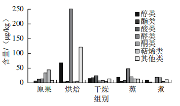 圖1表明,干燥后的揮發(fā)性物質相對于原果都有一定幅度的減少,例如醇類、酯類、酸類、萜烯類減少是由于干燥后烯烴類遭到破壞,同時可以看到沙棗中的醛類物質較多,尤其是在烘焙處理中含量最多,醛對棗果實的風味有顯著影響。