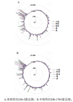 快速氣相色譜型電子產品鼻是基于仿生學原理,由傳感器傳感器陣列和模式識別系統組成,是一種新型電子分析儀器,其采用2根極性差異的色譜柱DB-5和DB-1701對氣味實現快速識別與解析,具備直觀簡便、重復性好等優(yōu)勢,結果見圖4。原果和干燥處理后的樣品總體出峰情況比較相似,烘焙和蒸、煮處理后的樣品在各個出峰部位的峰面積顯然放大,說明各種香氣物質濃度含量及其總體香氣強度增加,與原果及干燥處理后相比具有一定差異。